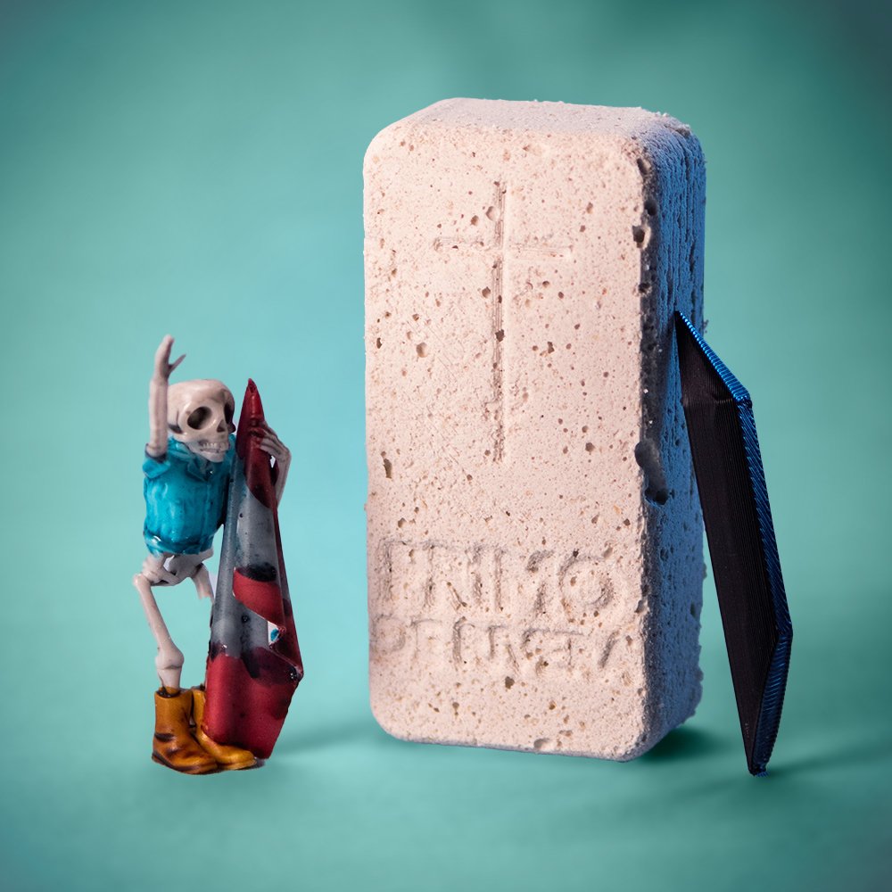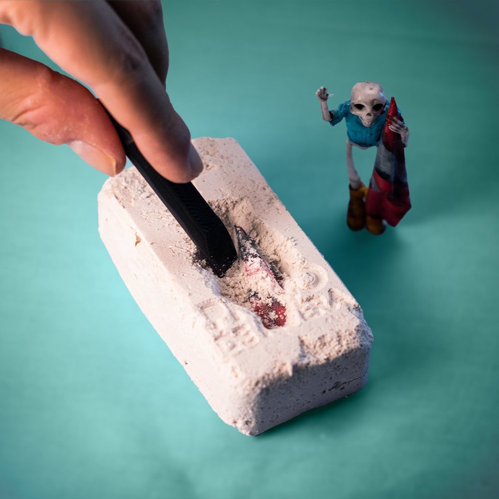 Uso: La figuras se pintan a mano y a pesar de estar barnizadas, la pintura se puede desprender si se desentierra con demasiada violencia. El kit incluye una lápida con una figura de 65mm dentro y un cincel.